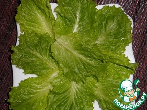 Листья салата вымыть и обсушить. Выложить слой листьев на плоское блюдо.