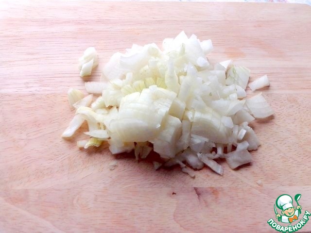 Лук мелко нарезать и ошпарить кипятком, чтобы избавиться от горечи. Слить горячую воду и ополоснуть лук холодной водой, чтобы остудить.