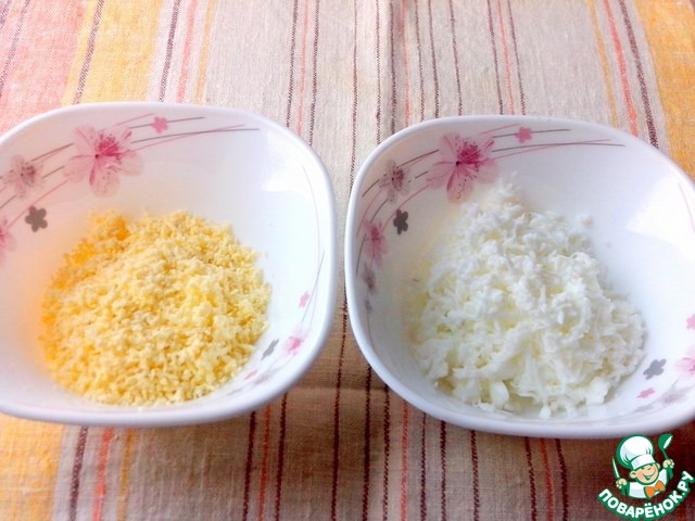 Вареные яйца почистить, отделить белки от желтков и натереть на мелкой терке.