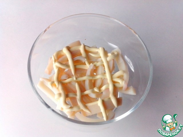 Кальмары очистить, помыть, положить в кипяток ровно на 3 минуты, вынуть и остудить. Затем нарезать тонкими брусочками.
