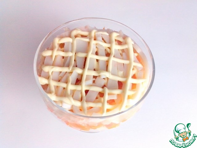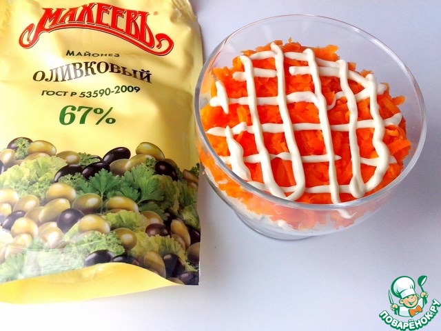 Выкладывать подготовленные ингредиенты тонкими слоями. На слои наносим тонкую майонезную сетку. Я использовала майонез ТМ "Махеев".