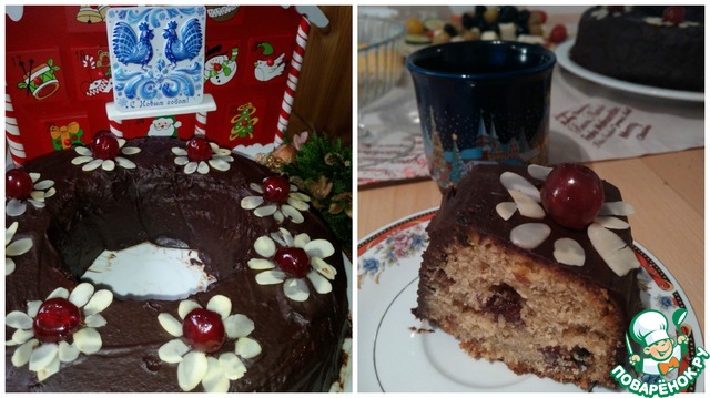 Затем достаем из формы. Переворачиваем на блюдо и поливаем шоколадом. Для этого шоколад поломаем и смешаем со сливками. Разогреем на водяной бане. И польем. Верх я украсила миндалем и вишней. Приятного аппетита.