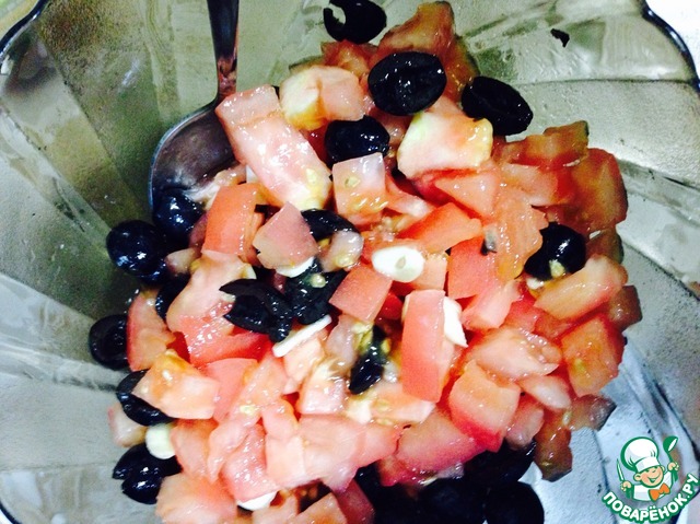 Помидоры ошпариваем кипятком, снимаем с них кожицу и крупно нарезаем. Так же крупно режем маслины. Мелко нарезаем чеснок и заправляем все ингредиенты оливковым маслом. Ставим на 20 мин в холодильник