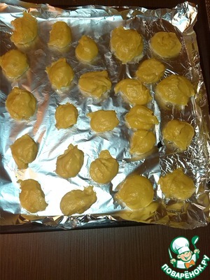 Выкладываем на противень. У меня форма получилась разная, т. к. нет кондитерского мешка, и делать сама я его не умею ))) поэтому воспользовалась ложкой.