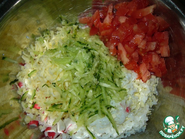 Добавить натёртый на крупной тёрке маринованный огурец и мелко нарезанный помидор