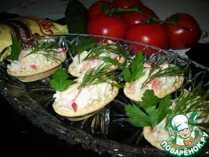 Салат перемешать, наполнить им тарталетки и украсить по желанию зеленью