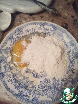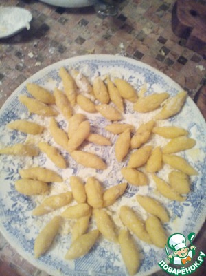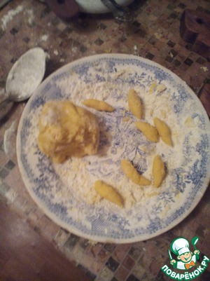 Делаем клёцки. У меня 1 яйцо чуть соли и примерно 3 ложки муки. быстро мнём тесто мука смотрите. по сантиметрику отщипываем ив ладошкаx 5 раз туда сюда. складываем и мукой присыпаем. важно.
