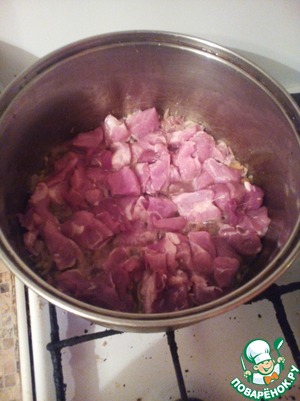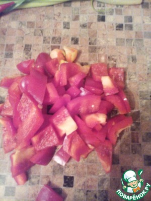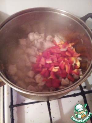 Поджариваем пока мясо побелеет. Болгарский перец режем таким-же кубиком как и мясо.