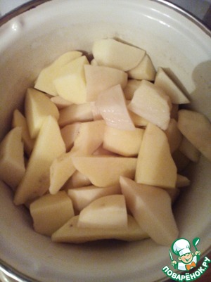 Картошку чистим и режем на четвертинки. Очень важно. По длине. Картошка средненькая. У меня была здоровая я ещё попалам разрезал.