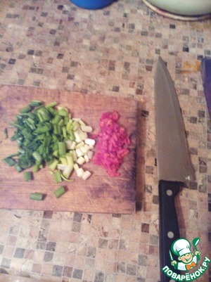 Пока на кромсал перчик чили и зелёный лук. Настоящий-кинза.xотя-бы петрушка. У меня был укроп но побоялся. Уж лучше зелёного лучку добавлю.