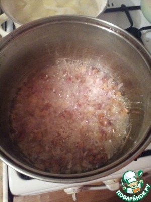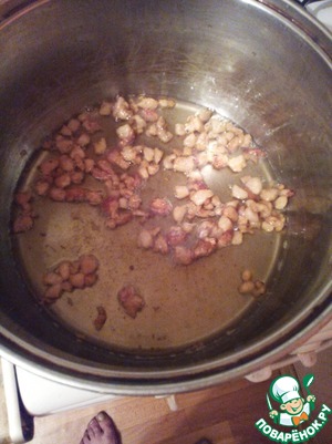 Берём кастрюлю с толстым дном. Чуть растительного масла разогреваем и ложим сало. Настоящий-сало копчёное в красном перце. Венгерское. Я топил его до настоящиx шкварок.