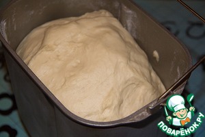 Тесто готовим опарным способом (я замешивала в хлебопечке на режиме "Пицца", программу отключила после первого замеса и оставила тесто на расстойку на 45 минут).