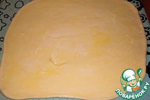 Раскатать подошедшее тесто в прямоугольник (примерно 40*35) толщиной 0,5-0,7 см. (рабочую поверхность слегка смазать растопленным сливочным маслом или присыпать мукой). Смазать растопленным сливочным маслом.