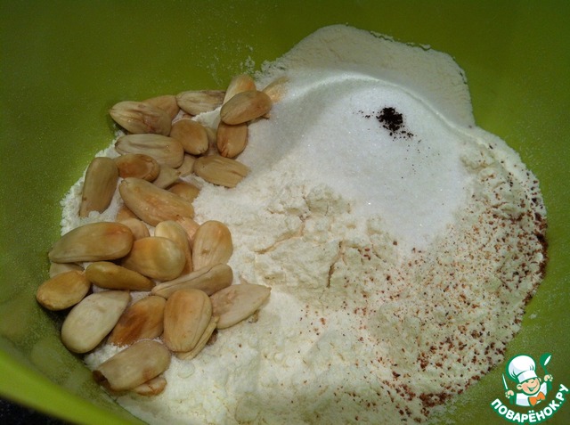 В миску с мукой положить миндаль, сахар, ванильный сахар (у меня ваниль), цедру лимона, мускатный орех, соль.