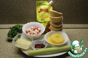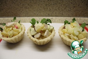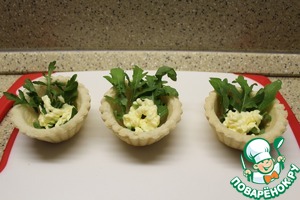 На дно тарталеток выкладываем рукколу, немного майонеза.