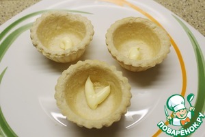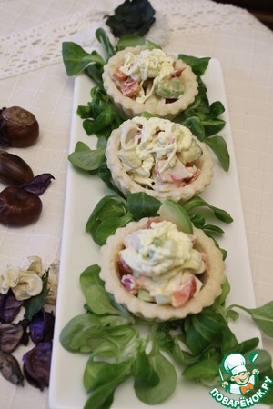 Заполнить тарталетки салатом, украсить майонезом, листьями салата и подать.