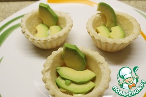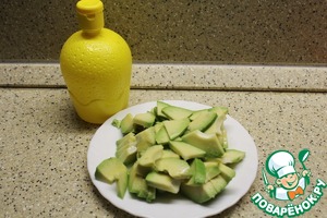 Авокадо почистить, разрезать на четыре части, удалить косточку и нарезать тонкими ломтиками, сбрызнуть лимонным соком.
