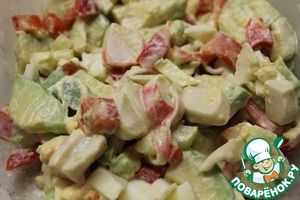 Предлагаю еще один вариант салата с крабовыми палочками, который отличается от №1 более нежным, а благодаря авокадо даже сливочным вкусом.