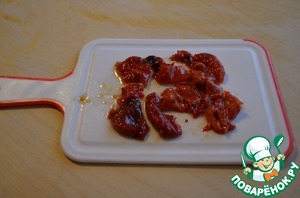Печеный маринованный перец или вяленые томаты порезать небольшими кубиками.
