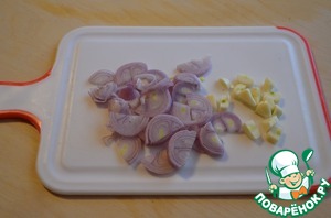 Лук-шалот почистить и порезать полукольцами, почистить чеснок порезать кубиками.