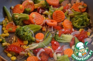 Нагреть сковороду на среднем огне, разогреть масло, обжарить лук и чеснок, добавить овощное ассорти, и слегка обжарить.