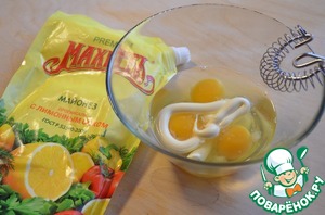 Яйца вбить в миску, слегка посолить, добавить майонез, при помощи венчика хорошо взбить.