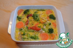 - Ассорти овощное (у меня смесь из моркови, броколли, кукурузы, горошка в стручках) — 150 г