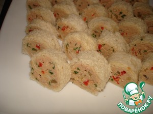 С хлебных ломтиков срезать корки и раскатать скалкой