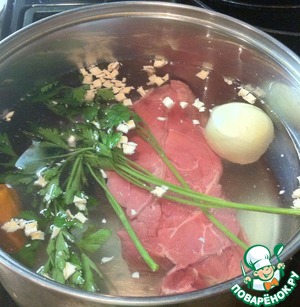 Говядину отварить до готовности с любыми кореньями и травами. Остудить в бульоне. Время приготовления указано без учёта варки и охлаждения мяса.