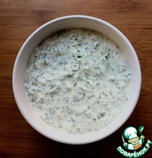 Желатин замочить в воде. Майонез оливковый от Махеевъ смешать с йогуртом и хреном. Зелень петрушки измельчить и добавить к майонезной смеси.