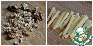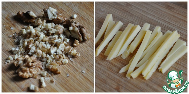Орехи порубить. Твердый сыр нарезать брусочками либо натереть на крупной терке.