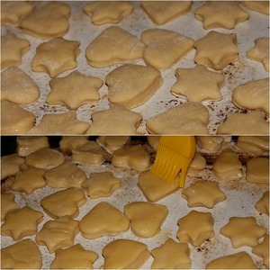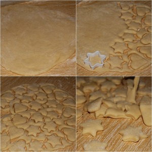 Выложить тесто на присыпанную мукой поверхность стола, раскатать пласт 0,5 см. Вырезать формочкой для печенья фигурки.