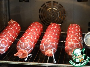 Воткнуть в одну из колбас температурный датчик, уложить батоны на решетку д/ш;