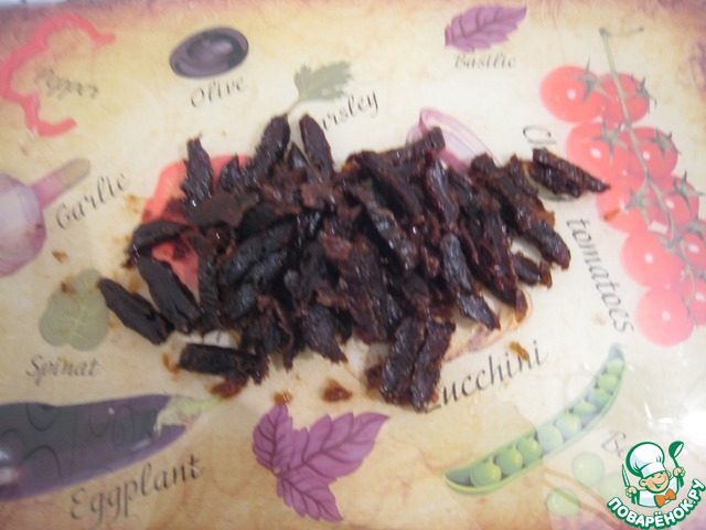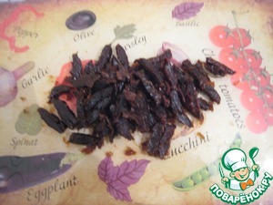5. Чернослив залить горячей водой, оставить на 20 мин., затем нарезать соломкой