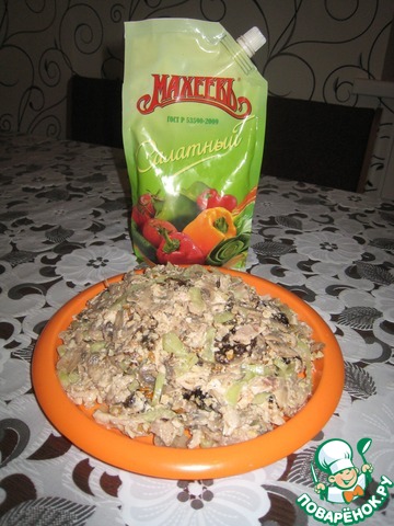 9. Соединить курицу, грибы, огурцы, чернослив, орехи, посолить, поперчить, заправить майонезом "Махеев-Салатный" и выложить горкой в тарелку