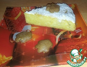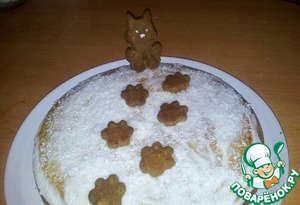 Далее украсить по желанию. Я смазала верх сметаной, смешанной с сахарной пудрой, посыпала кокосовой стружкой. Несколько столовых ложек теста смешала с корицей, отдельно испекла в формочках и сделала следы и котенка.