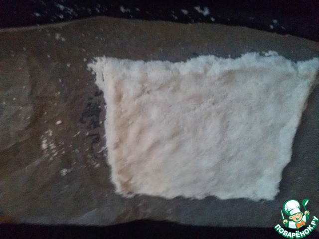 У нас получается пласт примерно 18х20 см. Ставим нагреваться духовку на 180 градусов по Цельсию. У меня в духовом шкафу 5 разъемов для противня - выбираю 2 сверху и ставлю туда противень с тестом на 30 минут. Последние 5-10 минут поглядываем, чтобы низ не был слишком темным.