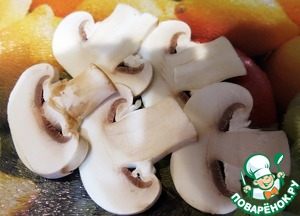 Шампиньоны тонкими пластинками. Я брала только часть с ножкой.