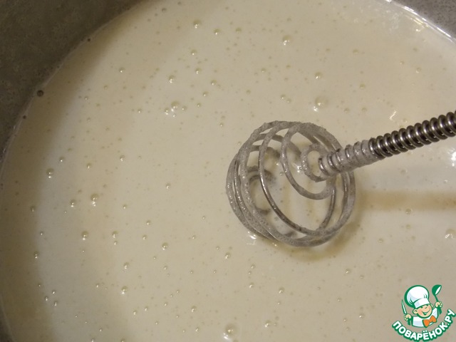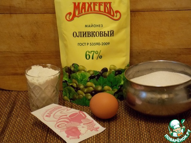 Яйцо, сахар и ванилин растираем до бела. Добавляем майонез и разрыхлитель, перемешать.