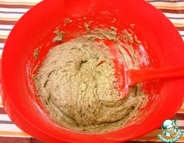 Потом – ржаную муку, смешанную с пекарским порошком. Муки может понадобиться чуть больше или меньше, тесто должно быть достаточно густым.