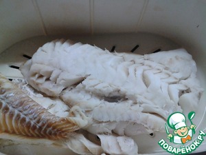 Рыбу отварить в пароварке. Если нет пароварки, можно отварить в кастрюльке. Не солить!