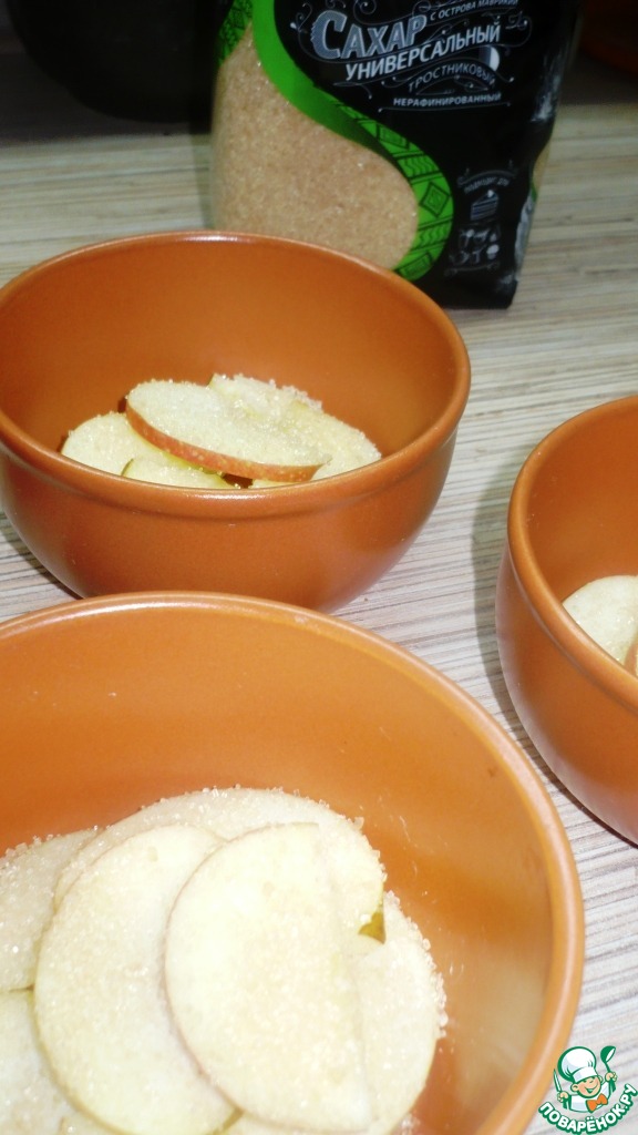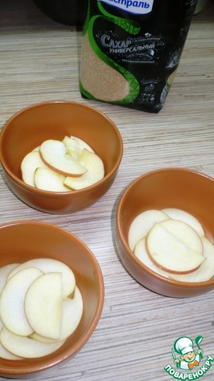 На дно формы для запекания (=16см) или в порционные креманки кладем нарезанное яблоко