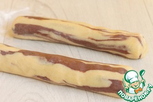 Теперь делим каждую часть пополам и смешаем темное тесто с белым. Такими кусочками порвем тесто и складем.