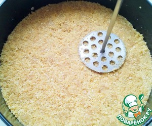 В разъемную форму 21 см. выложите печенье и утрамбуйте. Положите в холодильник, пока будем готовить крем. -