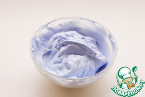 Сливки взбить до густоты. Разделить крем на две мисочки. В одну мисочку добавить 1-2 капли фиолетового пищевого красителя.