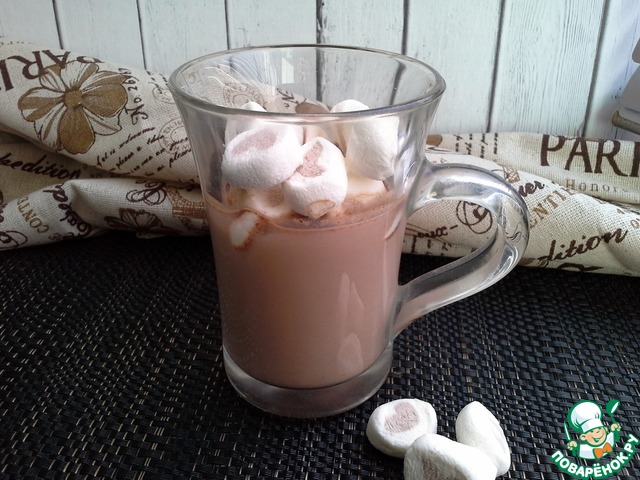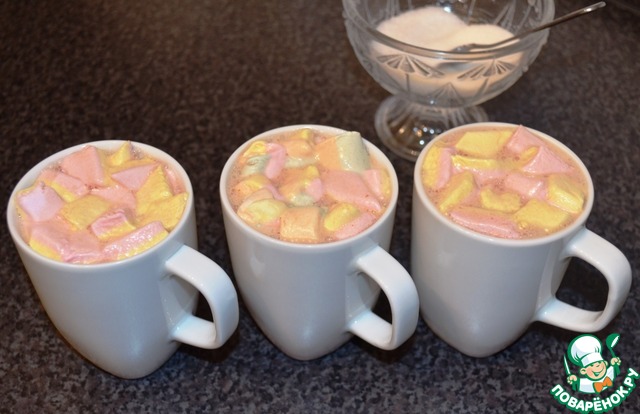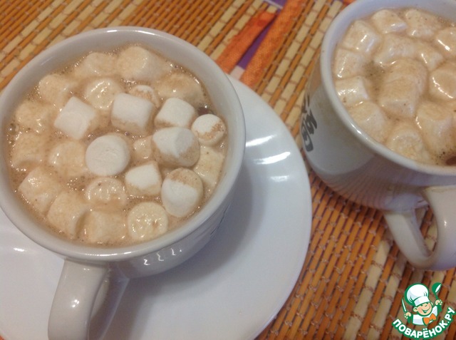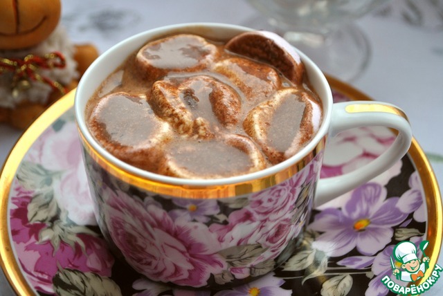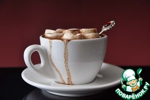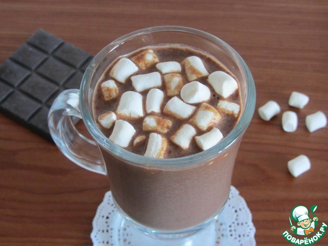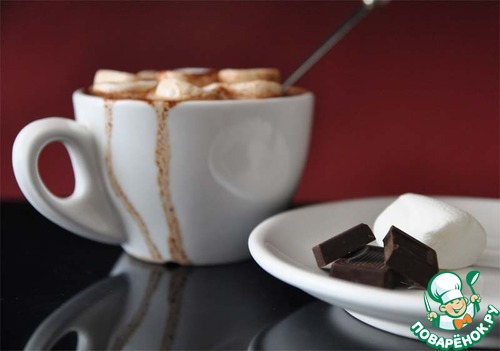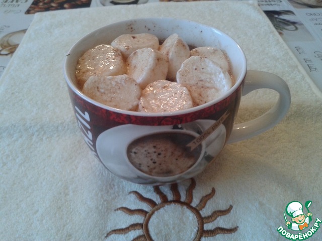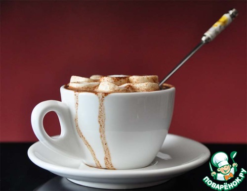 Наливаем в кружку горячий шоколад. Даём постоять около 5 минут, маршмеллоу начинает таять, это просто божественно на вкус.