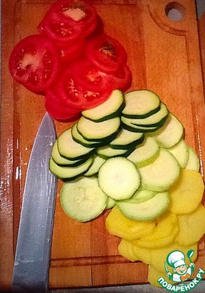 А затем переместите в посуду для выпечки. Пока готовятся лук и чеснок, нарежьте остальные овощи...