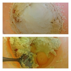 • Добавить муку и разрыхлитель. Растереть тщательно ложкой. Добавить яйца и взбить