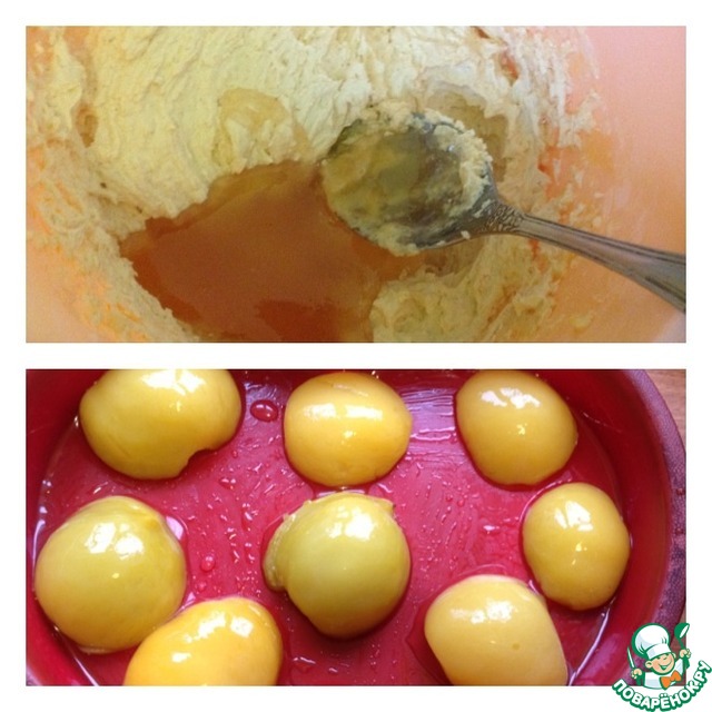 • Добавить жидкий мед и еще раз взбить. В форму смазанную сливочным маслом выложить половинки персика