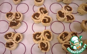 Нарезать рулет кружочками толщиной примерно сантиметр, склеить по три кружочка, слегка смачивая края водой. Вот такие улиточки. Печь около 15 минут при 180 градусах. Но лучше смотреть по своей духовке – моя трудилась почти полчаса, чтоб довести печенья до чуть золотистого цвета. Готовые печеньки остудить и посыпать сахарной пудрой.